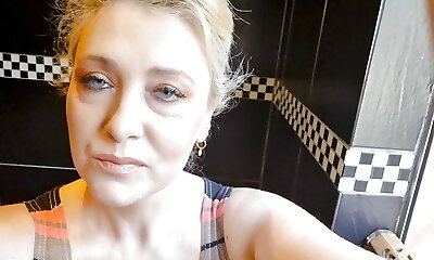 Obese mature Blonde struggles to pee on toilet so she undresses and slaps her cooter